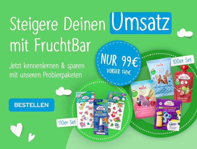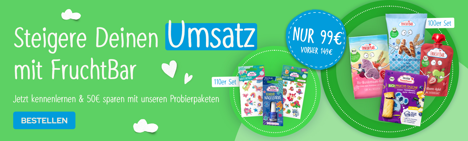 Unsere Probierpakete sind ideal für alle, die das FruchtBar Sortiment entdecken möchten und neu in ihr Geschäft aufnehmen möchten. Wähle zwischen unseren Bio Snacks oder unserer Wunderbunt Kinderkosmetik - und steigere Deinen Umsatz mit FruchtBar!